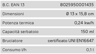 Bruciatore compatto da 150 ml doppio fondo in acciaio inox e lana di roccia, certificato UNI EN16647.