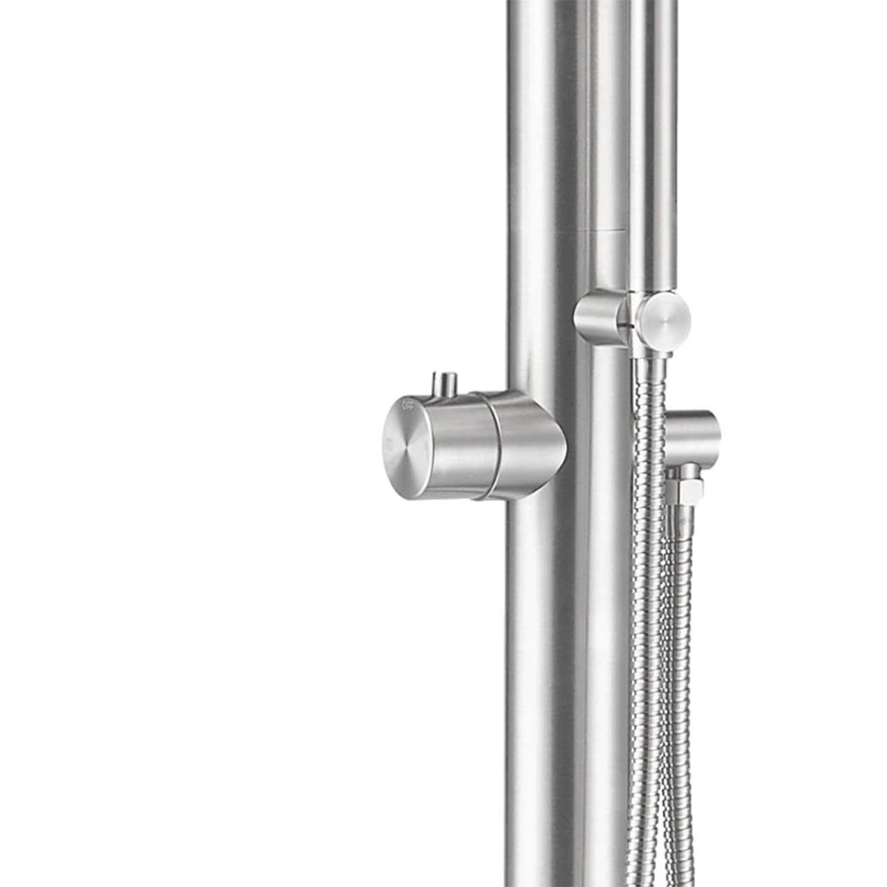SINED Doccia Per Esterni mod. Sassari In Acciaio Inox Satinato Con Ingresso Acqua Calda e Fredda Miscelatore e Doccino a Mano Corpo e Accessori In Acciaio Inox Marino Aisi 316l Con Fusto Diametro 6 Cm Attacchi Acqua a Scomparsa.